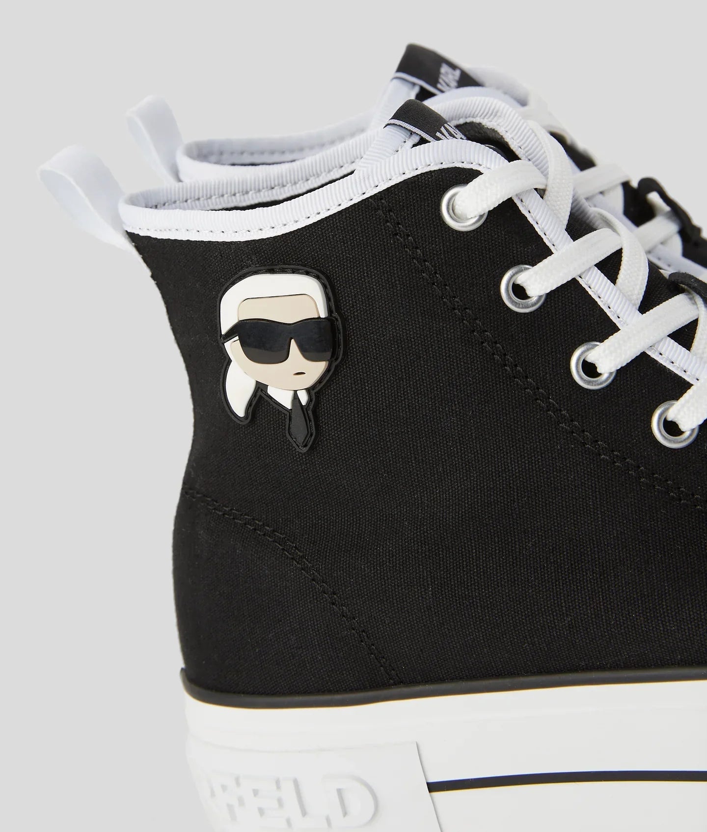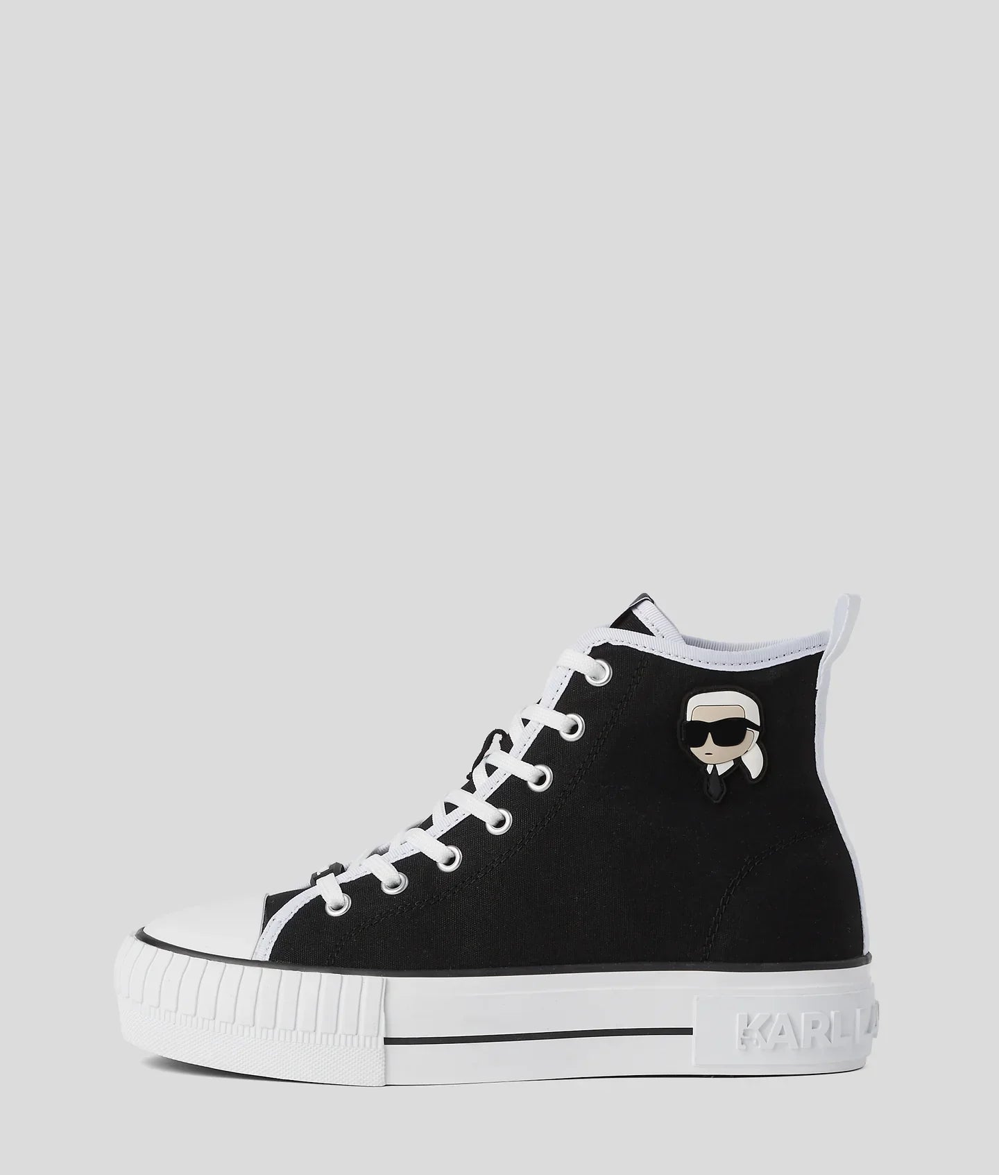 Crafted from Italian canvas, this KARL LAGERFELD high-top, graced with a distinctive NFT rubber dome patch, offers a lace-up design that complements its bold plateau midsole, ensuring an unmistakable fusion of comfort and avant-garde style.