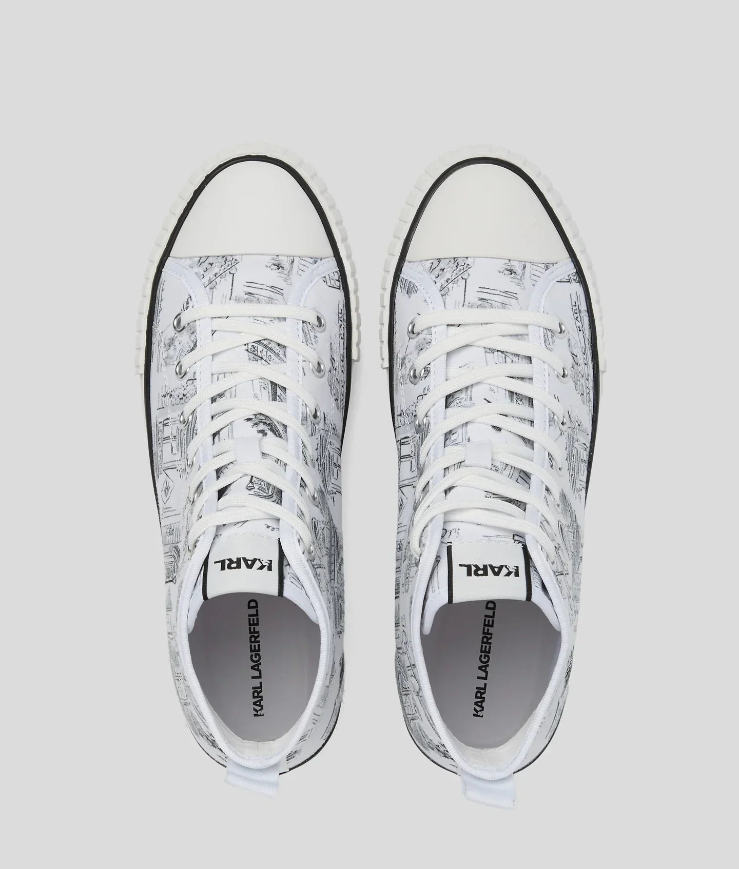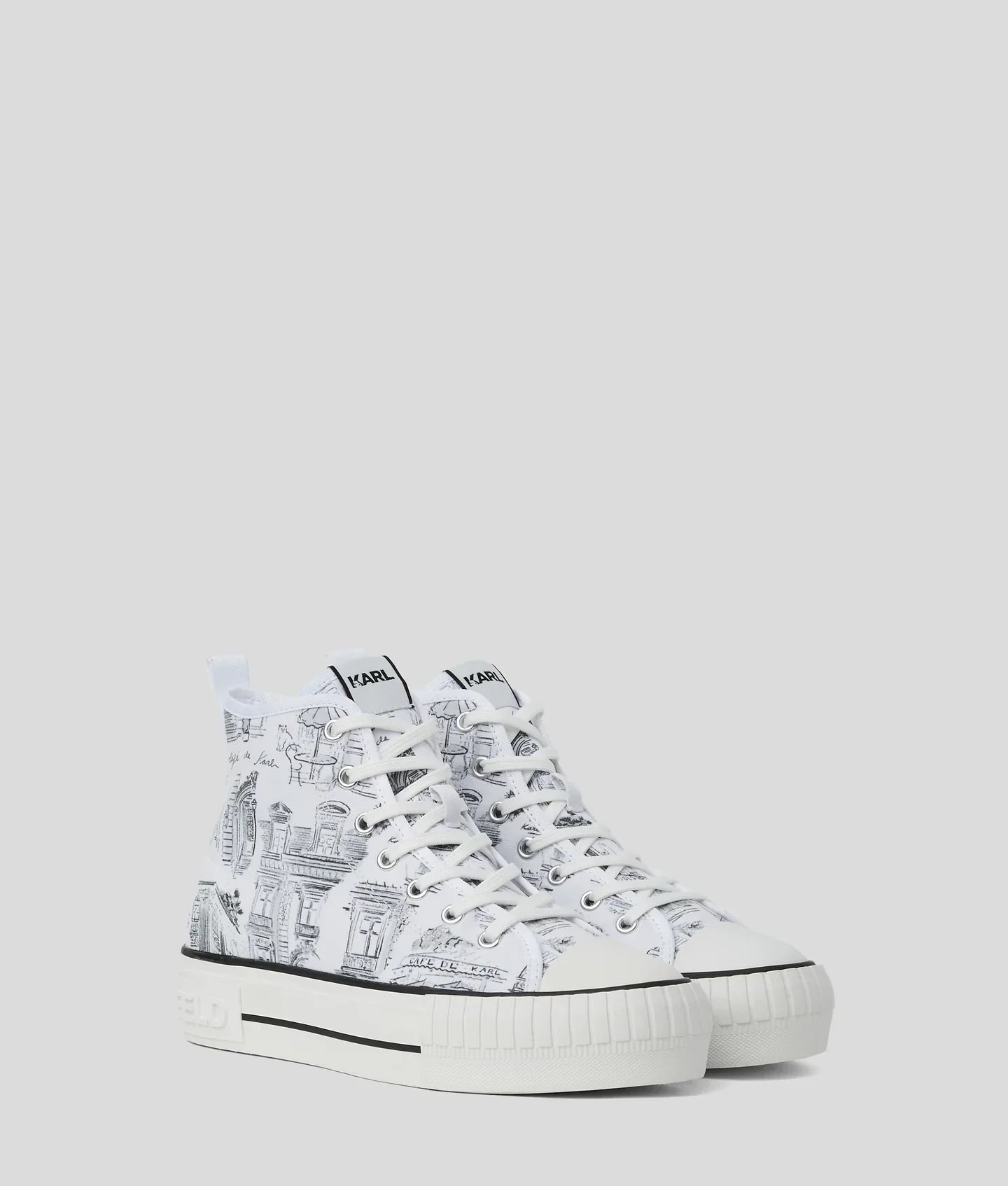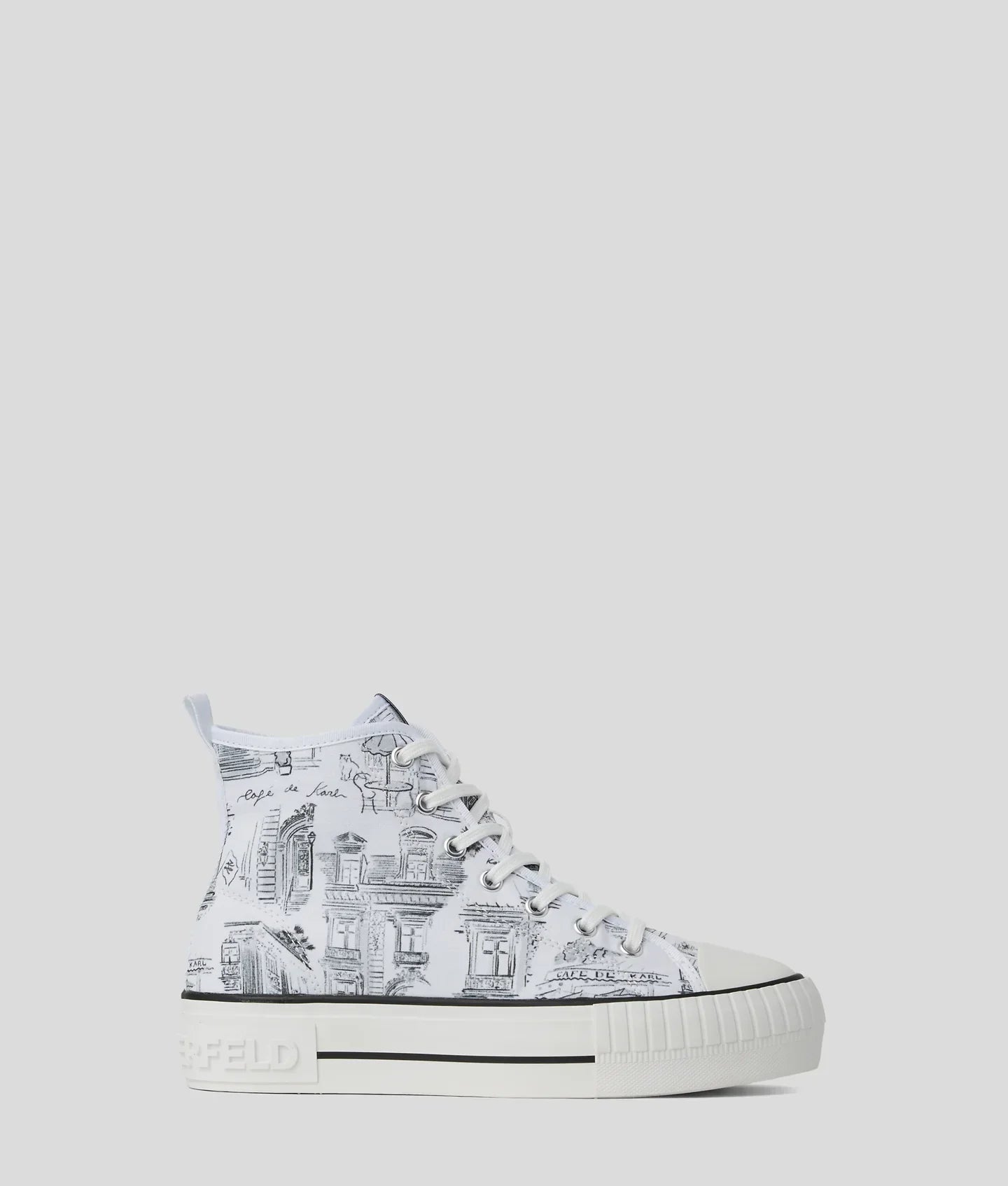 Designed in collaboration with renowned Spanish illustrator Jorge Parra, these high-top sneakers feature a striking 'Café de Karl' print. The lace-up design and rubber toe cap offer both comfort and flair.