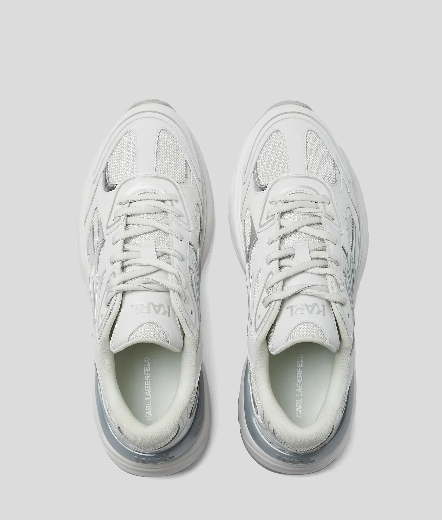 Elevate casual outfits with these striking sneakers, featuring a high-shine patent and metallic leather construction. The chunky rubber outsole ensures comfort, while the KARL Autograph logo adds an elegant finish.