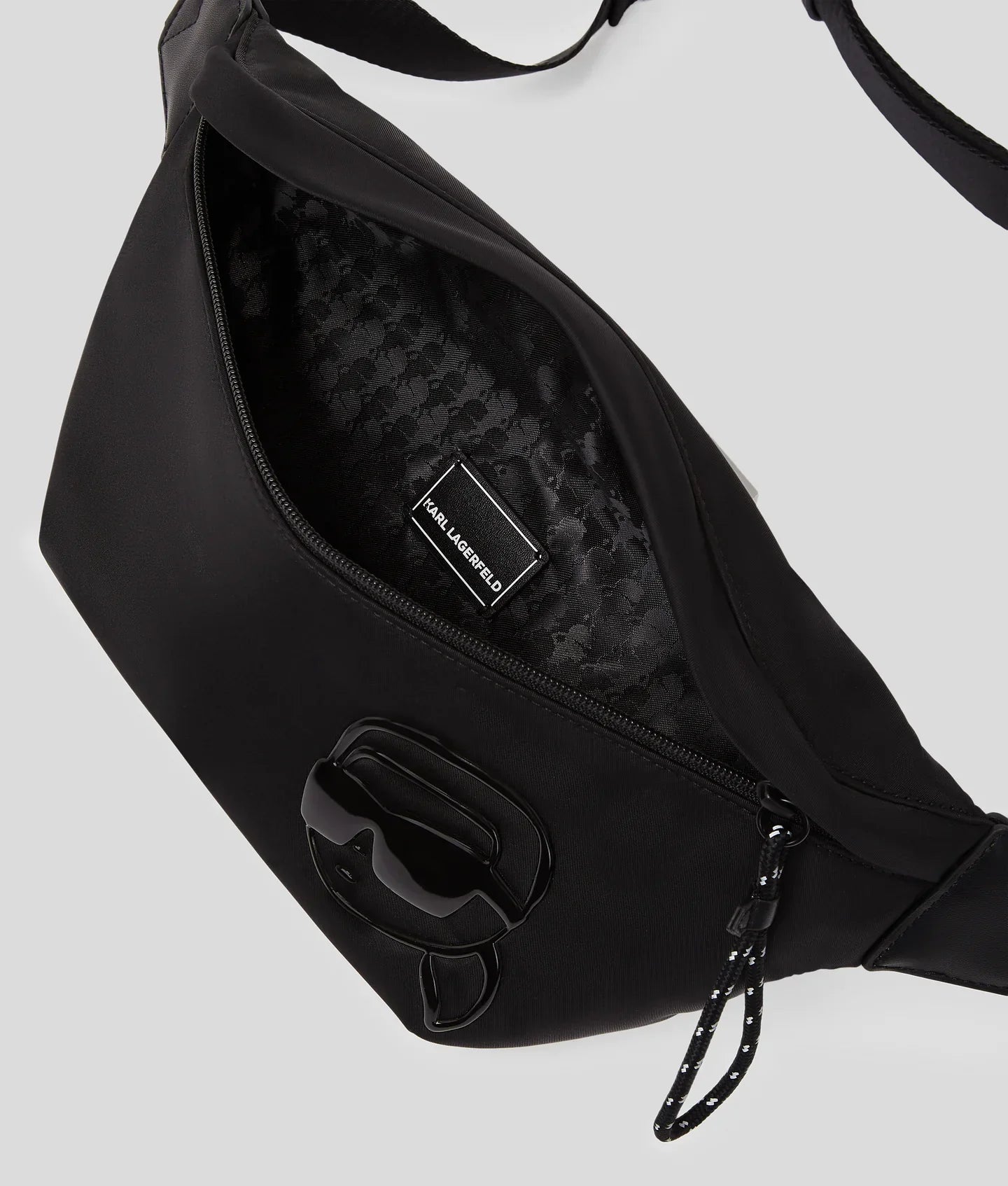 This belt bag combines modernity and practicality, featuring a secure zip closure and an adjustable strap for versatile wear. It is elevated by tonal IKON Karl artwork, making it a standout addition to your everyday accessories.