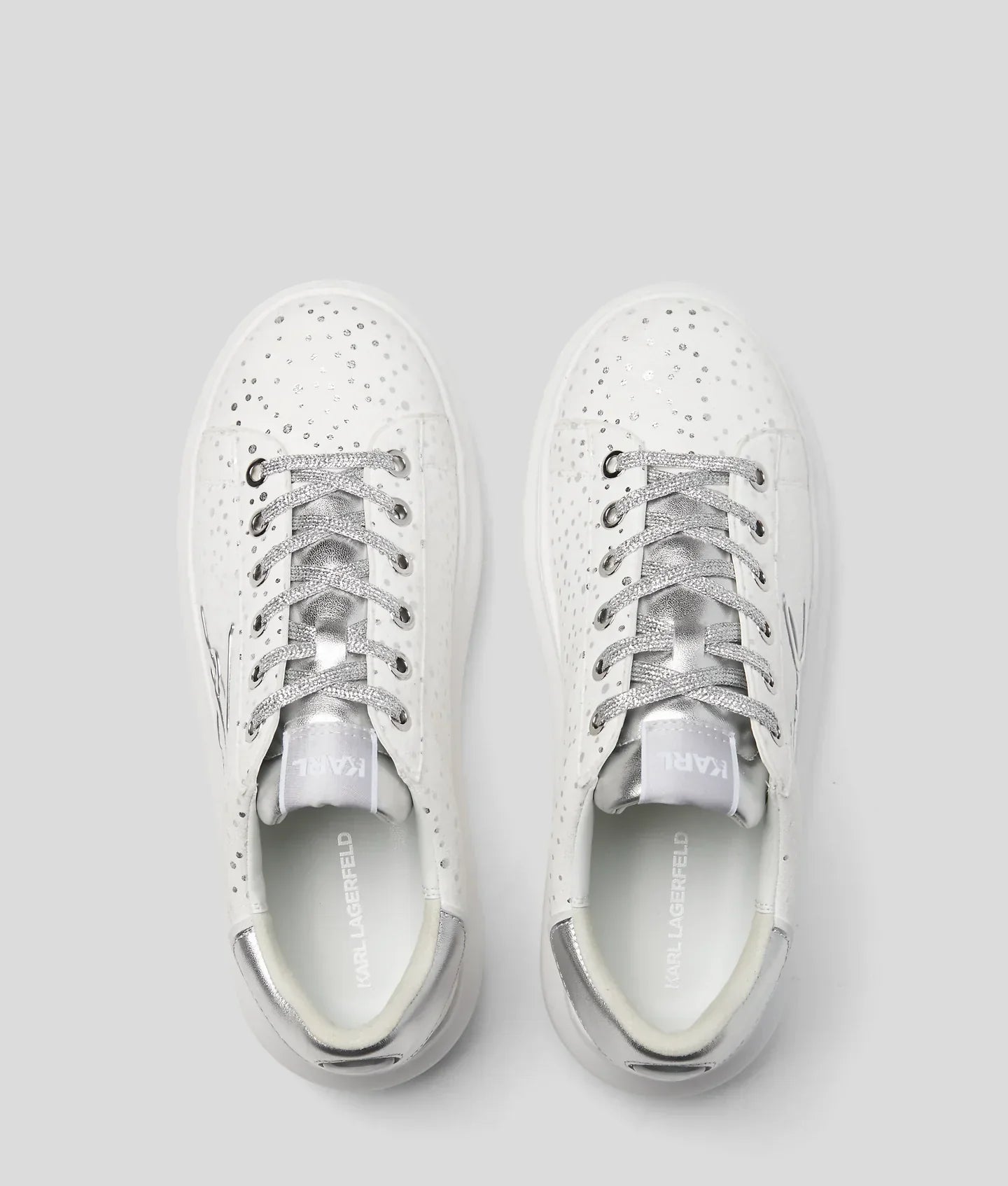 Add a touch of sparkle to any outfit with these eye-catching sneakers featuring all-over glittering embellishments. Anchored by a high-shine contrasting heel counter and bold KARL Signature artwork at the side, they are the perfect blend of glamor and comfort.