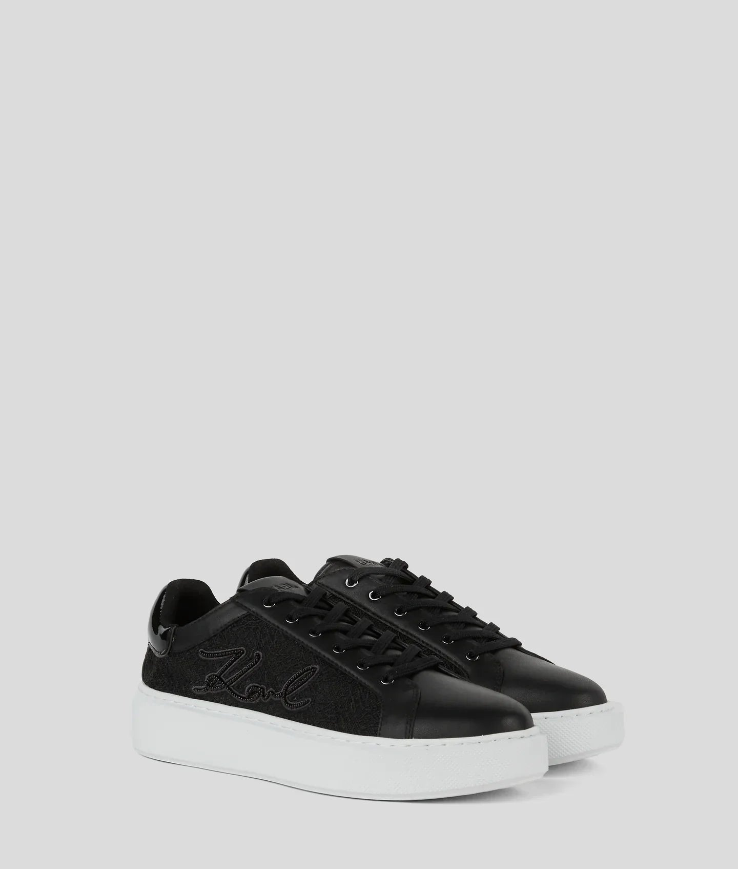 Upgrade your style with these head-turning sneakers, featuring a multi-textured leather upper and a standout wedge sole. Decorated with the iconic KARL Autograph on the laces and beaded KARL Signature artwork, these sneakers make a statement with every step.
